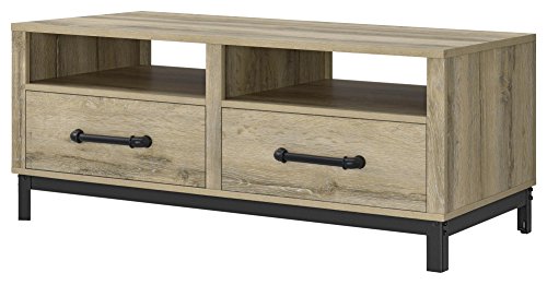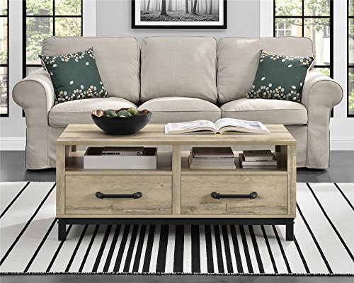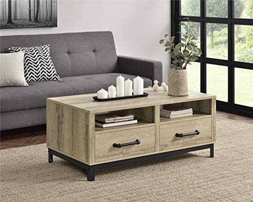 Add a rustic yet industrial style to your living room with the Ameriwood Home Paradox Coffee Table for an eclectic look. The light brown woodgrain finish of the laminated particleboard give the Coffee Table a rustic look while the contrasting metal base adds an industrial flair and gives more stability to the table. The table top offers plenty of space to display decorations and place your cell phone and coasters. Keep your magazines and books organized with the 2 open cubbies that are easy to access from either side of the table.Give your living room a rustic yet industrial look with the Ameriwood Home Paradox Coffee Table