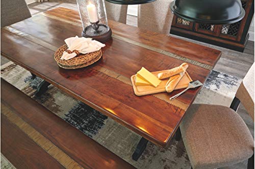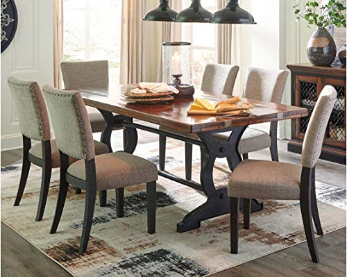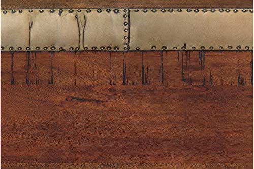 Made with Acacia solids and feature a slab top with brass toned hand nailed metal bands that run the length of the tops. Base has the look of an antique industrial cast iron with stretchers for stability. Table can seat up to six people comfortably. Server is made with Mango solids with decorative metal filigree doors. Traditional moulding details with eclectic turned bun feet. Dark tone wood on the side chair complement the tone of the metal base. Chair cover is a trendy textured gray fabric accented with small nail heads.CRAFTED WITH PRIDE: Made with Acacia solids and feature a slab top with brass toned hand nailed metal bands that run the length of the tops. Base has the look of an antique industrial cast iron with stretchers for stability. Table can seat up to six people comfortably. Server is made with Mango solids with decorative metal filigree doors. Traditional molding details with eclectic turned bun feet. Dark tone wood on the side chair complement the tone of the metal base. Chair cover is a trendy textured gray fabric accented with small nail heads.