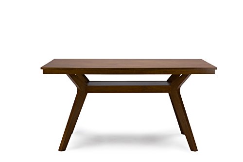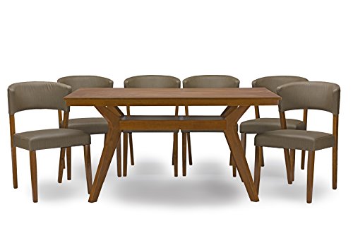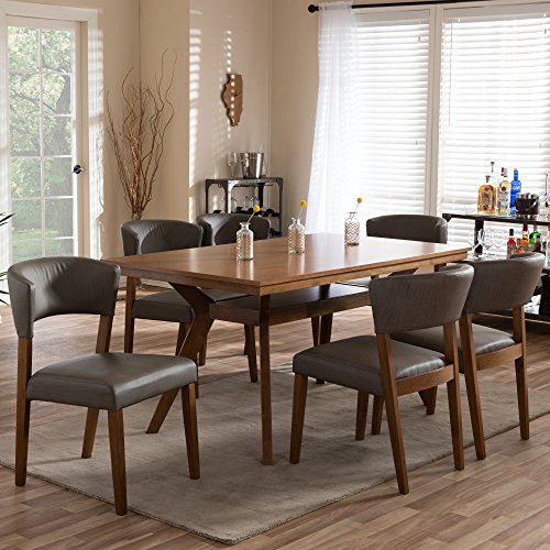 The Montreal Mid-Century 7PC Dining Set is ideal to gives your dining room a quick and elegant makeover. This dining set furniture includes a dining table constructed of solid rubberwood and six grey faux leather upholstered dining chairs. The rectangular table is built with a thick wood top and is finished with dark walnut veneer to give you a smooth dining surface. Underneath the table top, an open shelf is served as the storage space for your utensils, cups, plates and condiments. The X-based legs supporting the table are uniquely shaped to provide a modern look. The six matching dining chairs are curved on the backrest to for a modern look. This dining set fits comfortably for 8-10 people, invite your friends and family over for dinner!Mid-Century design 7-piece dining set includes: 1 dining table; 6 dining chairs