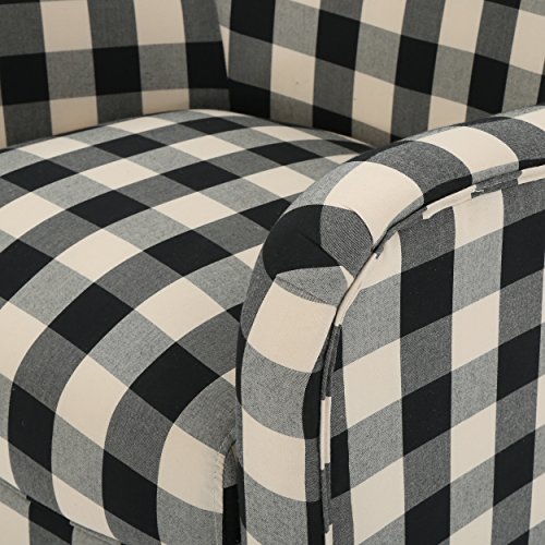 This Club chair is a welcome addition to any home. With its slightly curved back and low set seat, this chair is perfect to curl up on with a blanket, a cup of hot Coco, and your favorite book, or show. The cushioned seat provides extra comfort to all who sit in this chair, so much so, that you will have to put a permeant claim on the chair when hosting to make sure you can keep it for yourself."Includes: one (1) Club chair material: fabric composition: 100% polyester Leg material: Birch color: Black & White Plaid Leg Finish: dark brown light assembly required Hand crafted details dimensions: 30.25 inches deep x 30.00 inches wide x 36.25 inches high Seat width: 22.50 inches Seat Depth: 21.50 inches Seat Height: 18.00 inches Arm Height: 24.00 inches"