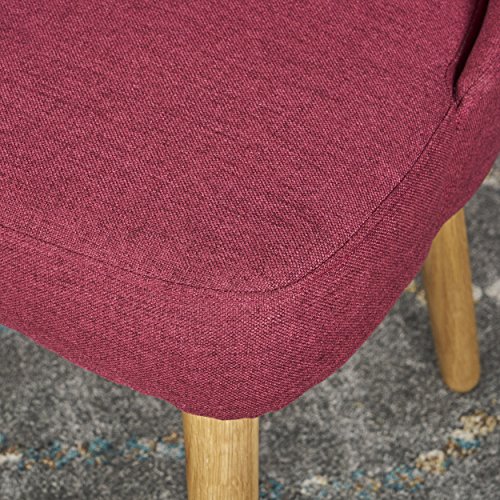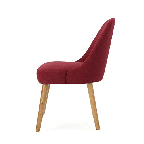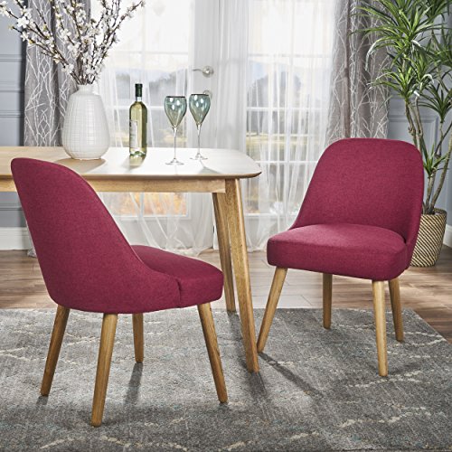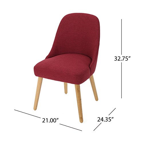 Attractive and immensely comfortable, these dining chairs will bring an elegant flair to your dining room. Built according to exacting standards, these chairs are set atop durable and handsome oak legs. They are versatile enough to be used as additional seating in other parts of the house."Includes: Two (2) Dining Chairs Material: Fabric Composition: 100% Polyester Leg Material: Oak Color: Deep Red Leg Finish: Natural Light Assembly Required Hand Crafted Details Dimensions: 24.75 inches deep x 22.00 inches wide x 32.75 inches high Seat Width: 21.00 inches Seat Depth: 19.50 inches Seat Height: 19.00 inches"