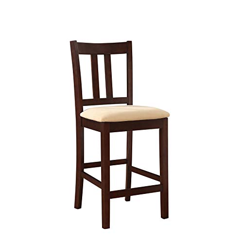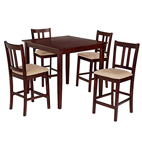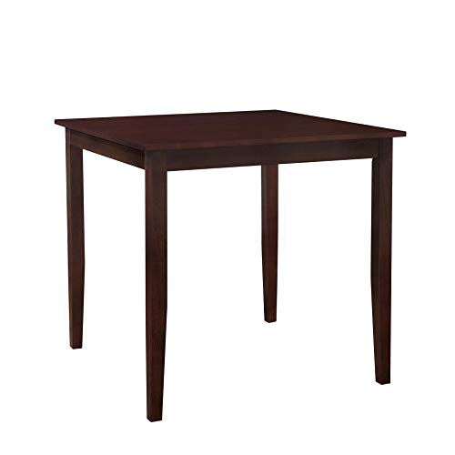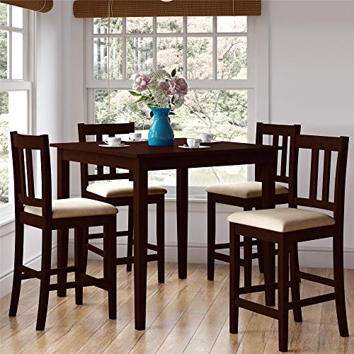 Anchor your kitchen or dining area and share meals with family and friends with the traditional warmth of the Dorel Living Virginia 5 Piece Counter Height Dining Set. With clean lines and a solid, sturdy construction, this dining table and chair set features elegant details like the spacious tabletop’s wood grain finish, two tone solid wood chair design and a warm, inviting espresso finish. The counter height design is perfect for small space living, as the chairs are able to tuck neatly under the table when not in use. Inspired by the simplicity of the American Craftsman style, the four chairs feature a contoured angled back, ideal for ergonomic comfort and upholstered with a lightly padded beige microfiber seat. The Virginia is a versatile dining set, able to be dressed up for a formal meal or casual settings. The Dorel Living Virginia 5 Piece Counter Height Wood Dining Set is an inviting set with simple charm that will easily add character and blend in with your home decor.This small spaces counter height dining set features a sturdy, solid square table with a wood grain finished top, four solid wood post legs and four upholstered chairs with a matching espresso finish
