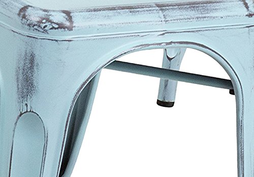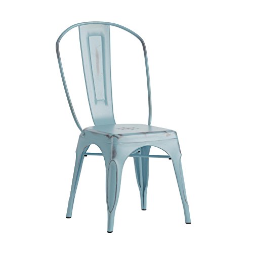 Completely transform your living or restaurant space with this distressed chair. Adding colorful chairs can rev up any setting. The versatility of this chair easily conforms in different environments. Chairs are lightweight and easily stack for storing. A cross brace underneath the seat adds extra stability and features protective caps that prevent the finish from scratching when stacked. The frame is designed for all-weather use making it a great option for indoor and outdoor settings. For longevity, care should be taken to protect from long periods of wet weather. The legs have protective floor glides that prevent damage to flooring.Stackable Bistro Style Chair