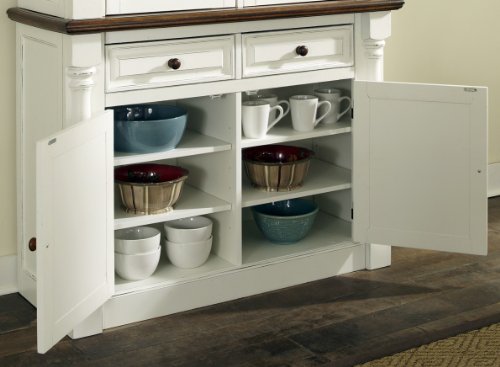 The Monarch Buffet by Home Styles blends upscale design with functionality. This Stylish Buffet blends hardwood solids, engineered wood and veneers with an affluent, rubbed white and nine-step distressed oak finish. The Monarch Buffet projects striking style with sophisticated picture frame moldings, solid wood pilasters with intricate carved detail, crown moldings and brushed nickel hardware. Bounteous storage is provided with two adjustable shelves behind each door and two large storage drawers with dividers and felt-lined bottoms. Size is 48-inch wide by 19-inch deep by 36.25-inch high. Assembly required.Sophisticated picture frame moldings and solid wood pilasters with intricate carved detail