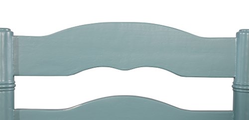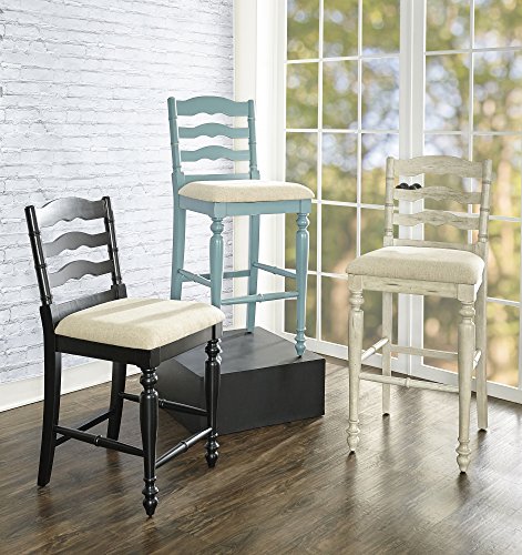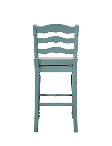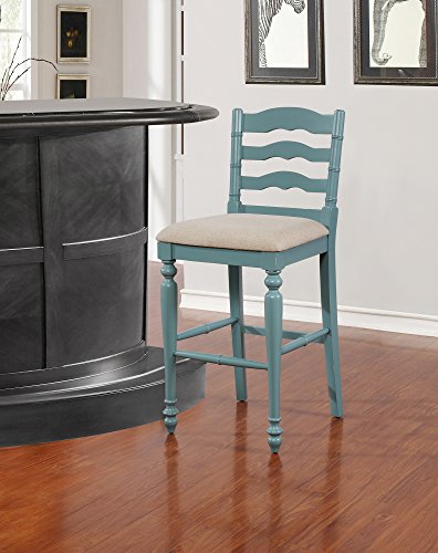 Unique and stylish, the presley stool will add high design and functionality to your kitchen counter or high top table. The front turned legs and curved back are both eyecatching and stylish. Completing the stools structured design are four added footrails for stability. Finished in an antique blue the stool has a neutral padded fabric seat. Bar Height.Neutral padded fabric Seat