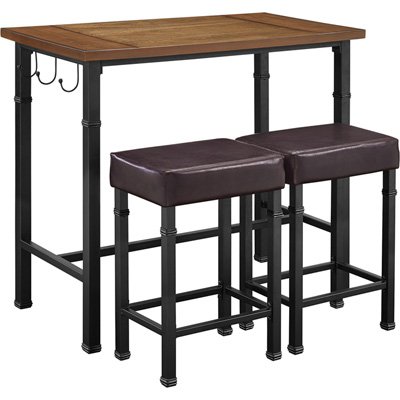 Includes one table and two stools. Rustic industrial style and design. Plush upholstered seats. Hooks on side for hanging towels, bags, etc.. Perfect for small dining rooms and kitchen breakfast nooks. Two brown PU upholstered stools, easily tuck beneath the table when not in use. Wood planked top has a rich brown finish. Perfect for small dining rooms and kitchen breakfast nooks. Warranty: 30 days limited. Made from MDF, wood, metal, CA foam, PU and veneer. Black finish. Assembly required. Stool weight capacity: 275 lbs.. Table: 42.13 in. W x 22.5 in. D x 36.25 in. H. Stool: 17.32 in. W x 11.81 in. D x 25.59 in. H.Includes one table and two stools