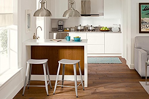 Now you can get a better view from up high with our classic backless counter stools. These trendy metal stools come with perforated curved seats and sturdy legs for hours of comfortable sitting. Plastic foot caps protect your floors and keep stools from sliding out of place. Comes in a set of two.Backless square counter stool with curved Seat with perforated detail.