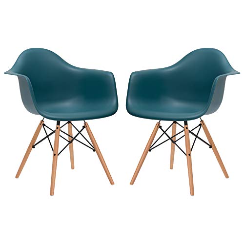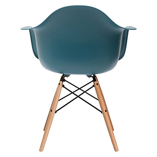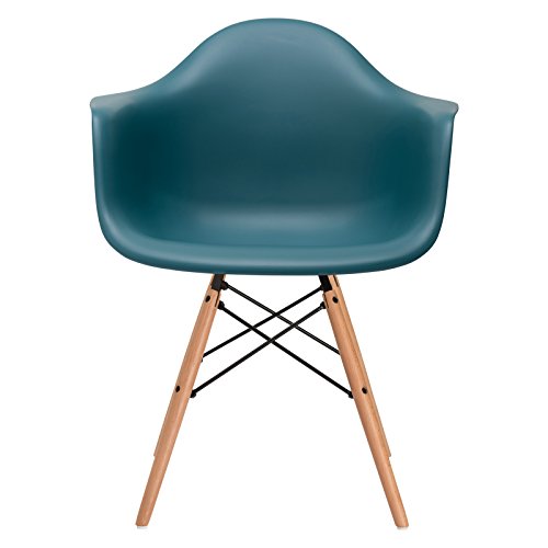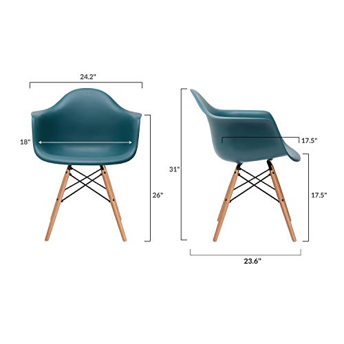 The brightly colored DAW Chair (Dining height Armchair Wooden base), first designed in 1948, is one of the most recognizable pieces from E.'s furniture collection. It boasts a beautifully flowing shell seat, which is molded to fit the lines of the body. The rolled edge prevents the seat from pressing into the back of the legs. This triumph of design was created for the "Low Cost Furniture Design" Competition at the New York Museum of Modern Art and went on to become the first mass-produced plastic chair. The innovative methods of molding and bending, developed by the popular designer, established the DAW Chair series as a true furniture icon of the 20th century. Poly+Bark produces the shell of this design classic in a quality and durable polypropylene plastic, available in several bright colors. It is supported by wooden legs interconnected by wires, adding an intricate touch to contrast with the chair's simple, organic design. Overall Product Dimensions:23.6"L x 24.6"W x 31.5"H Seat Dimensions: 17.5" D x 18" W x 18.1" H Arm Height: 26.3".Set of two (2) classic Eames style DAW molded plastic arm chairs