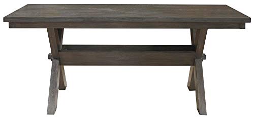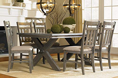The Turino 5 piece Dining Set includes a table and four chairs. The large spacious tabletop offers ample food and elbow room and seating space for many. Thick, sturdy legs in an X-design complete the piece. The side chairs feature traditional straight lines and simplistic chair backs. A luxurious tan fabric covers a plush seat. Finished in a grey oak stain, this piece is sure to complement any homes decor.A great family dining set