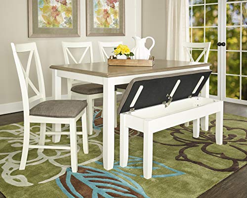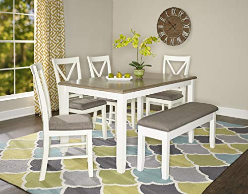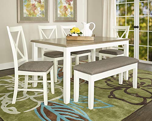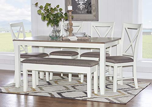 The Jane 6 PC dining set is a chic dining set that comes with a rectangular table, four chairs, and a storage bench. A beautiful painted restoration finish on the tabletop contrasts with the white finish of the legs and chairs. The X-back chairs and storage bench both have a comfortable upholstered seat with a grey menswear inspired fabric. Some assembly required.Set some's with a rectangular table