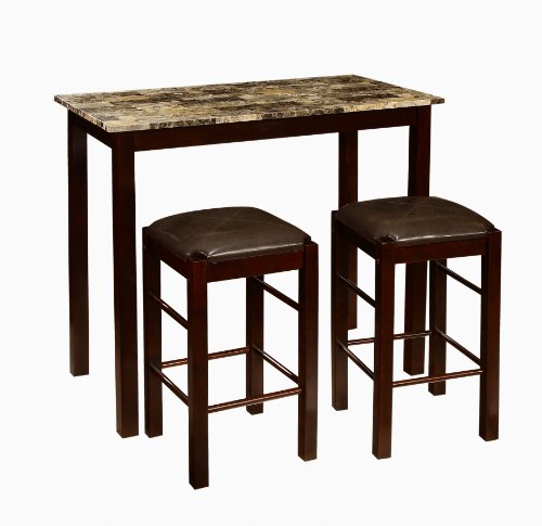 The table features a contemporary marble-look veneer table, dark brown finish legs, dark brown blended Leather durable. easy clean, sophisticated look and feel excellent sunlight resistance.3 in 1 package includes the Table and 2 Stools