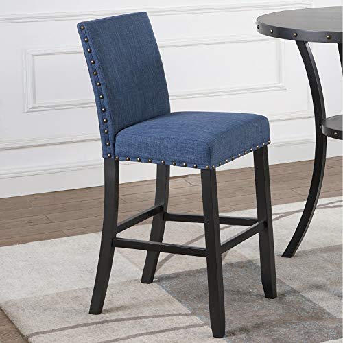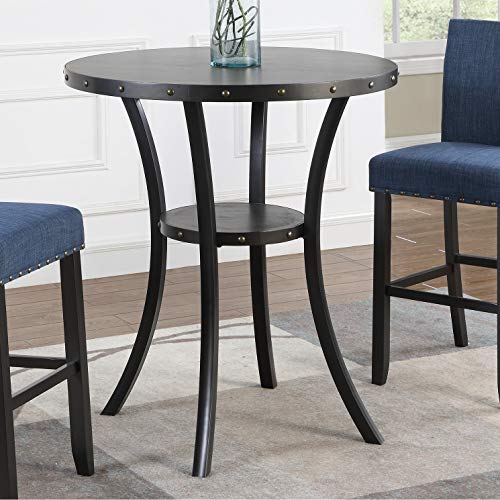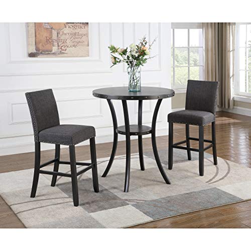 Cozy up for an intimate meal or drink around the Biony Bar Height 3-Piece Espresso Wood Dining Set. The lovely table has a wooden look table top in a rich toasted coffee bean finish, and has metal legs and framework, including studded trim work around the table’s edge. Extra table layer adding additional storage room and convenience. Two bar stools bringing comfort and contemporary. Highlighted with brass nail heads for on-trend flair. The circular table shape allows for 2 people to be seated comfortably around it, so enjoy your happy lunches, bright breakfasts, and cozy coffee or tea for years to come.3-piece bar Height dining Set includes one bar table and 2 bar stools, highlighted with brass nail-heads for on-trend flair