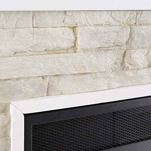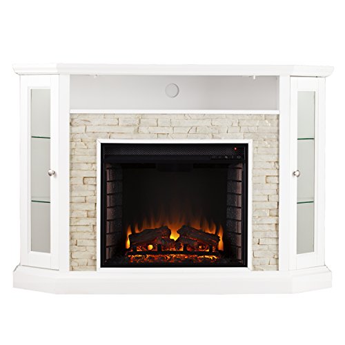 Warm up your style with this crisp White, electric media fireplace. Handsome, lifelike stacked Stone surrounds the firebox; wide open media shelf stores Entertainment equipment or electronics. Convertible mantel fits this curio fireplace into any corner nook or room, LED lit cabinets show off vases, tchotchkes, or DVD. Consider your space heating blues cornered with this convertible media fireplace centering your living room, anchoring an Entry parlor, or serving up rustic chic in the dining room. Energy efficient LED bulbs light the fire, a cost effective way to ignite bliss in any room without professional installation. User friendly remote control offers 4-way adjustability to customize the fireplace from the comfort of your sofa. Flames and logs each have 5-level adjustment, or off. An automatic shutoff and glass that remains cool to the touch ensure the fireplace warms safely. Turn off the heat to enjoy the fireplace ambience year round! this corner-convertible piece heats from 50 to 70 degrees in about 1 hour for a 14' x 14' x 8' room. Specifications: temperature ratings: 62-82 degrees at 4 degree intervals; heating/power: 120V/60Hz, 1500W, 12.5 amps; batteries: 1 CR2025, included. Dimensions include: overall: 52.25" W x 16" d x 36.5" h (flat), 52.25" W x 25.25" d x 36.5" h (corner); mantel: 32.75-37.5" W x 15" d, 32.75-37.5" W x 25" d (flat, corner); firebox front: 23" W x 20" h; media shelf: 35" W x 13.5" d x 5.25" h; media shelf opening: 33" W; cabinet shelves: 5.75" W x 6.25-11.75" d x 10" h, 5" W x 7-12" d x 10.5" h (adjustable: 2" up/down, fixed); glass doors: 4.5" W x 26" h; footprint: 52.25" W x 15" d. This hot item weighs approximately 102 pounds and supports up to: 85 pounds (mantel), 20 pounds (corner converter), 30 pounds (media shelf), 15 pounds (each cabinet shelf). materials include MDF, poplar, glass, polyresin, metal, resin. Assembly: required. Made in China.Electric fireplace offers remote controlled heating up to 400 square feet while lifelike flames and embers burn inside a brick style interior
