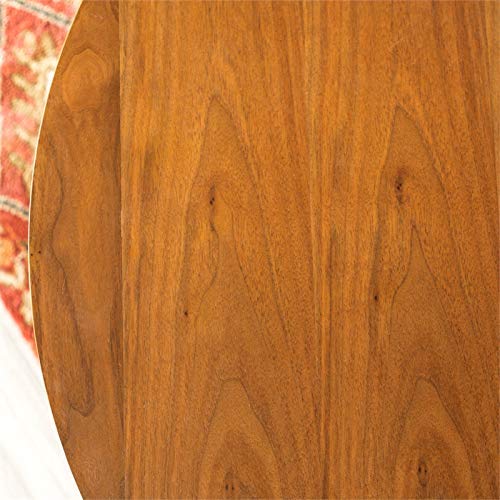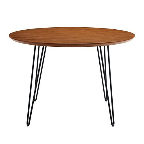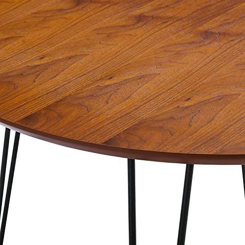 Carefully crafted with wood veneer, and supported by sturdy metal hairpin legs, this round, retro-modern dining table is an excellent choice to be your dining room focal point. No matter your style esthetic, the walnut finish paired with the classy hairpin style legs will fit right into your home. Perfect for entertaining, an intimate dinner for two, or game night with the family, you won't be displeased.Durably constructed of high-grade MDF and wood veneer