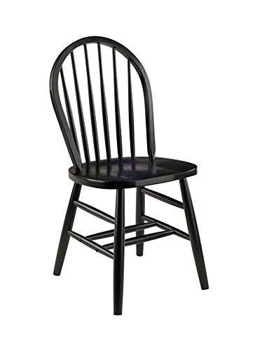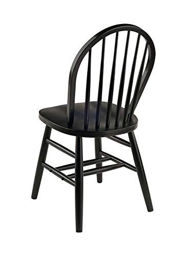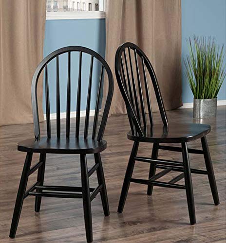As early as the 16th century, English woodworkers began fashioning chair spindles in the same way they made wheel spokes. This design became known as the Windsor Chair. This Winsome 2-Piece set carries that tradition forward in these classic and distinctive Windsor Chairs. The wide seats are contoured for maximum comfort, and the double set of crossbars make the chairs sturdy and durable. Easy to assemble, the chairs are made of Solid Wood in a Black finish. Use them to dress up your kitchen, dining room, or wherever you need extra seating. Seat dimensions: 17.3"W x 16.9"D seat back width: 17.75" seat back height: 20.25" seat depth (front to spindles): 15.50" seat height: 16.75" (to back) - 17.9" (to front) Outer distance of 2 front legs: 16.50" Static weight limit: 220 lbs. Some assembly required Ships in 1 boxConstructed of Solid Wood