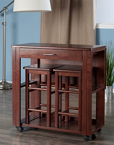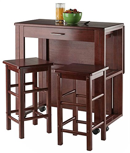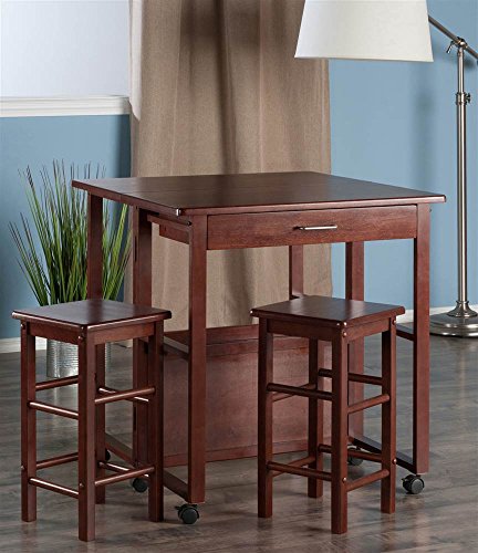 Includes table and two stools. Transitional style. Drop leaf supported by pull-out side panels. Create a dining table for two. Pull up two more stools for a couple of guests. Lower the drop leaf for a more compact piece that can be placed against the wall. Double as a console or serving table. Stools tuck easily underneath. Can be placed on the bottom shelf allowing both table and stools to be rolled as one unit. Raise the bottom shelf to create even more leg room. Table-wide drawer is ideal for silverware, napkins, and placemats. Rolling casters allow for easy mobility. Made of solid and composite wood. Rich walnut finish. Easy-glide drawer is finished with a satin nickel handle. Two of the rolling casters lock to secure the table's position. Gently rounded corners on both table and stools create a smoothly finished look. This product DOES NOT comply with the Composite Wood Product emissions standards as set forth by the California Air Resources Board. Resource: http://www.arb.ca.gov/toxics/compwood/retailersfacts.pdf. Made from solid composite wood. Made in Thailand. Assembly required. Table top with leaf open: 30.6 in. W x 30.7 in. D. With leaf closed: 30.6 in. W x 15.3 in. D. Leaf: 30.6 in. W x 15.3 in. D. Inside drawer: 22.6 in. W x 10.75 in. D x 3.1 in. H. Stool 11.5 in. W x 11.5 in. D x 21 in. H. Wheels: 2.2 in. H. Overall: 30.6 in. W x 31.5 in. D x 31.7 in. H (55.12 lbs.).Includes table and two stools