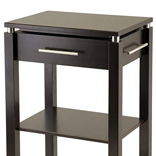 The contemporary styling of our Linea line has been expanded to include an entertainment cart.The cart is 21.65L x 15.75"W x 35"H; it comes with locking wheels, brushed stainless handle, one drawer and two shelves.The solid wood construction is finished in our rich espresso matte color.Overall Kitchen Cart size is 221.65"W x 16.38"D x 35"H.Top surface is 21"w x 15.75"D.One Large drawer 16.2"W x 12"D x 4.3"H. Two Shelves size is 19.4"W x 14.17"Middle/15.75"LowerConstruction with combination of solid and composite wood in espresso finish.Assembly Required
